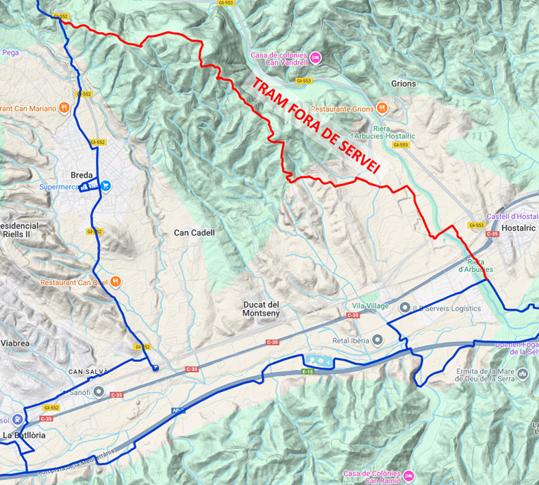 El tram de la ruta entre el Coll de n’Orri i Hostalric es troba temporalment fora de servei.